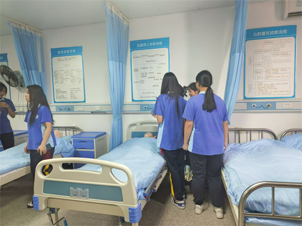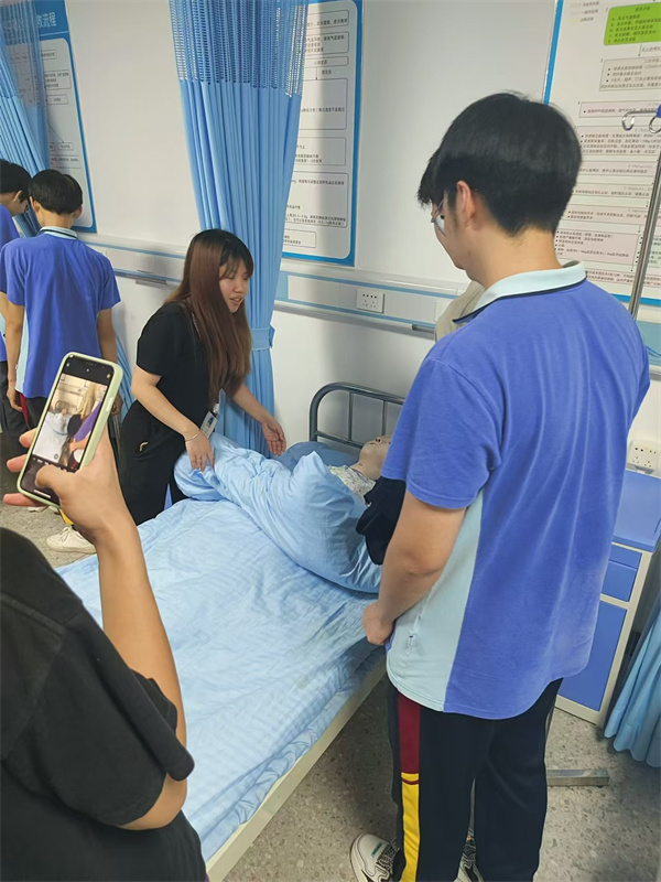 在模拟病房内,实训室教师特别设置了一场模拟护理演练。通过角色扮演的方式,让学生们亲身感受到了护理工作的真实环境和氛围。学生们纷纷表示,这种实地参观学习的方式让他们对护理专业有了更加直观和深入的了解,对未来的职业规划也更有信心了。