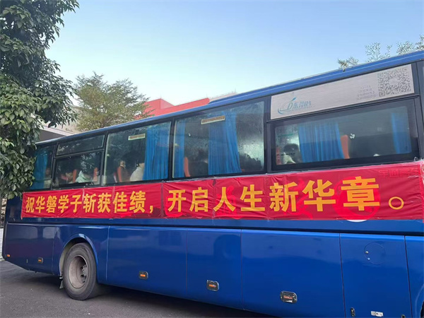 晨光熹微,校园早已被红彤彤的横幅装点得格外热烈,“决胜高考,无畏前行”“祝华磐学子笔锋藏壮志,答卷绘宏图”的醒目标语,在微风中舒展,为即将启程的学子们注入满满的力量。